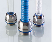 Like all PFLITSCH cable glands, the blueglobe CLEAN Plus® has a large-area spherical seal. In addition to sealing cables, they are also eminently suitable for the reliable installation of hygiene hoses and easily crushed corrugated conduits, such as those used in the food industry.